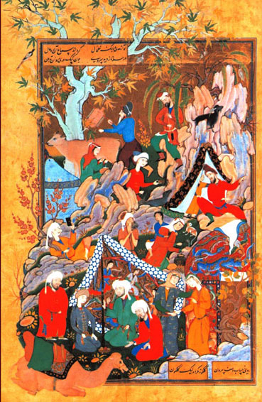 Фалак бир лаҳза уларга меҳрибонлик кўрсатиб, икковлари васл билан шод бўлишлари учун зарур шароитларни яратиб берди. Барча ҳайвонлару қушлар уйқу оғушида ором олишарди. Сайёралару юлдузлар икки севишганнинг шодлик кечасини ҳимоя қилиб, улардан кўзларини узишмас, субҳ совуқ нафасини урмас, бутун олам уйқуда эди.